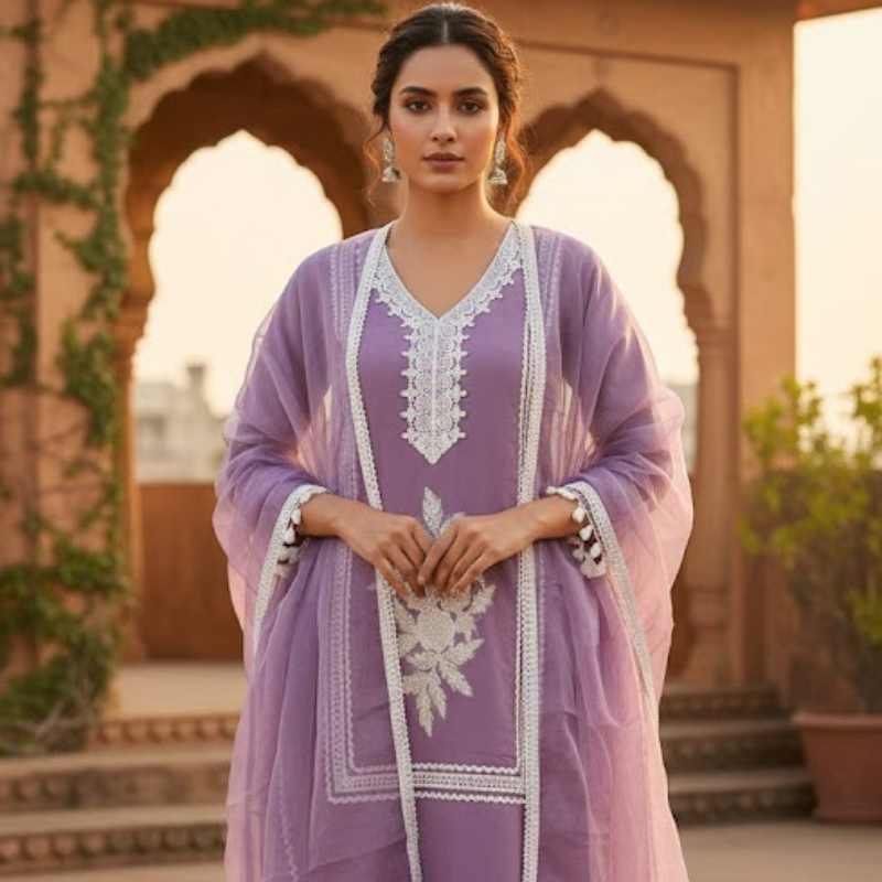 Step into effortless elegance with this dreamy lavender Roman silk suit paired with a sheer organza dupatta finished with delicate lace work. Soft, lightweight, and crafted to flatter, this best-selling ensemble brings together rich texture and timeless design — perfect for festive occasions, celebrations, or special gatherings.